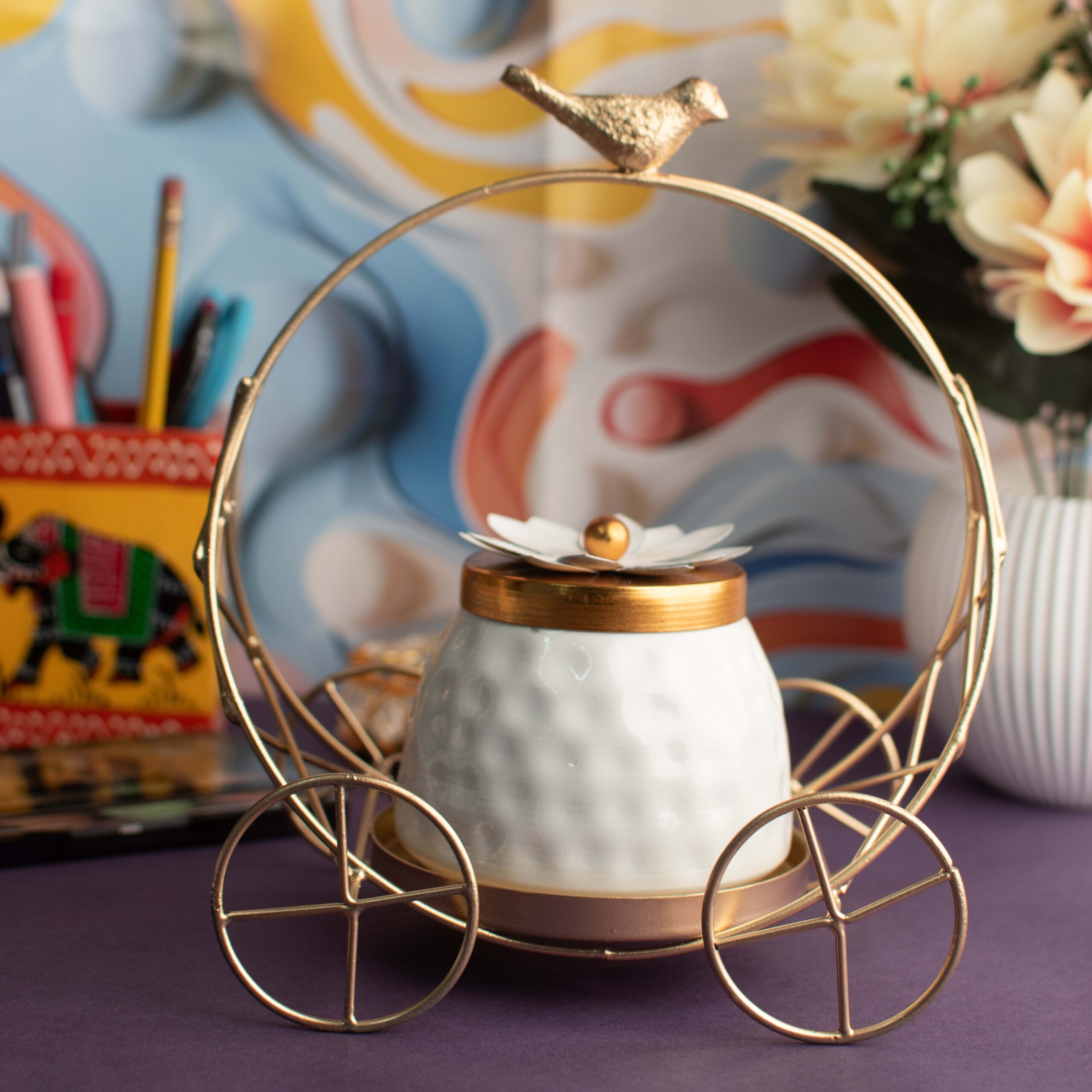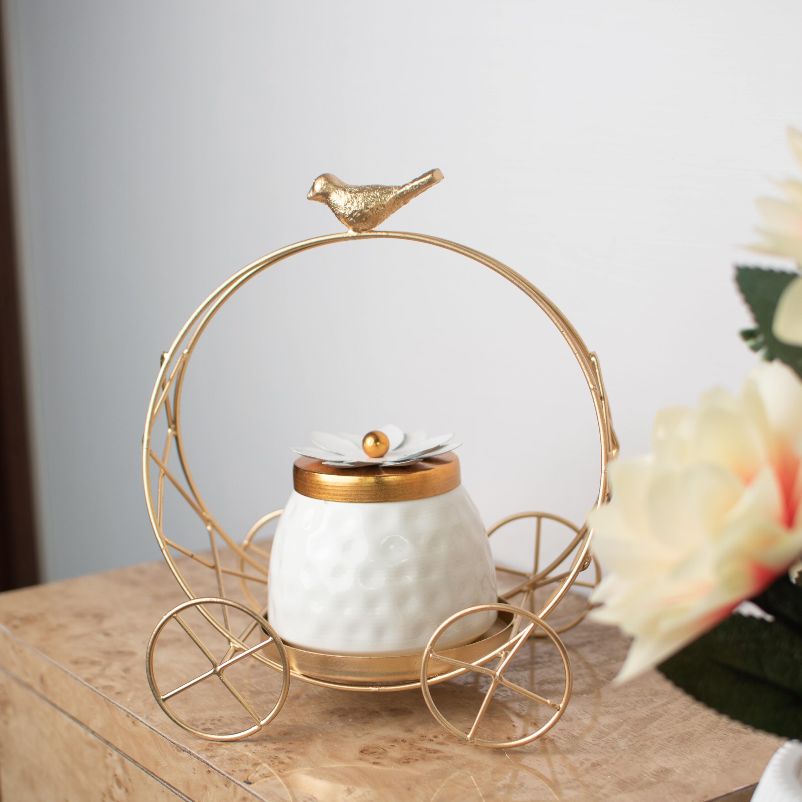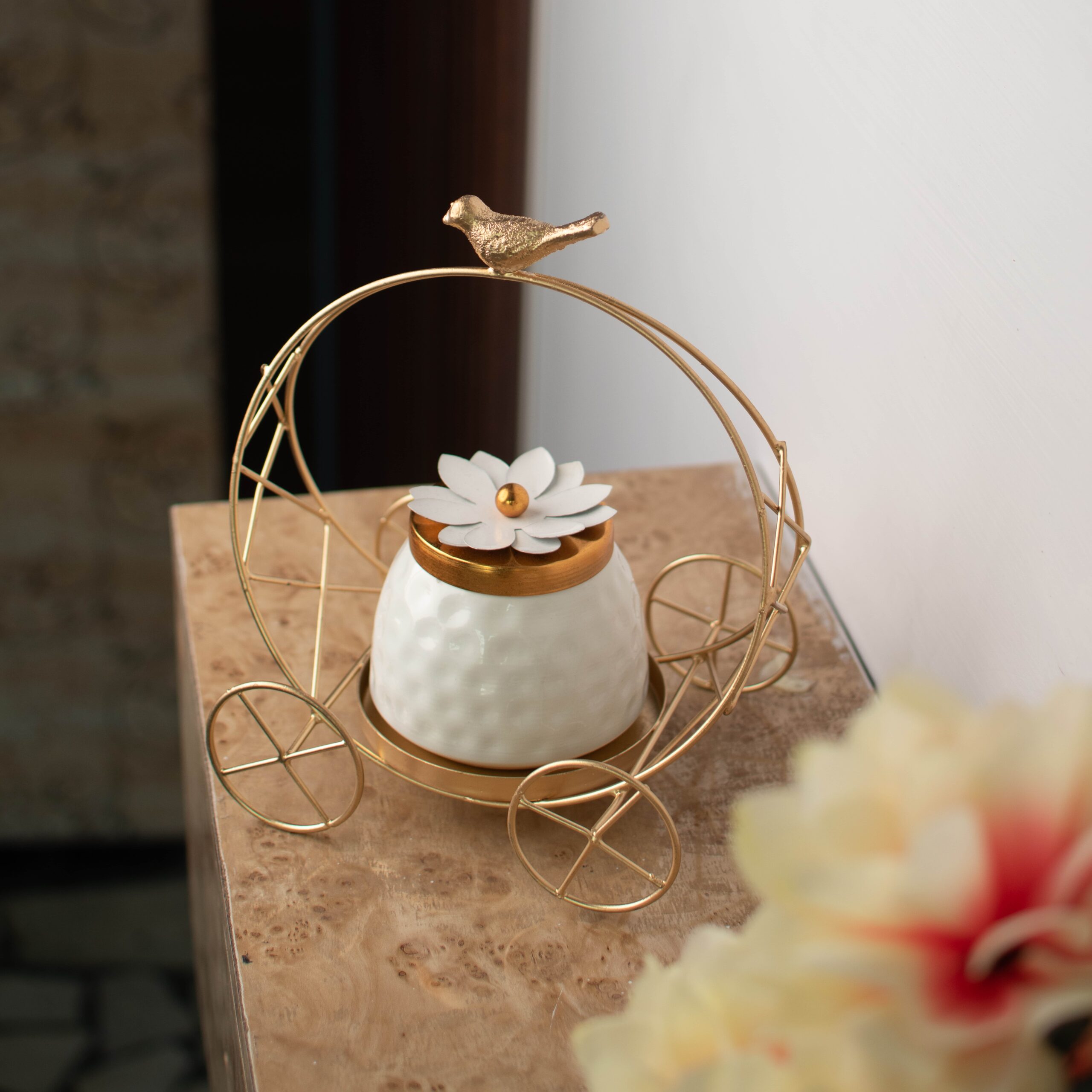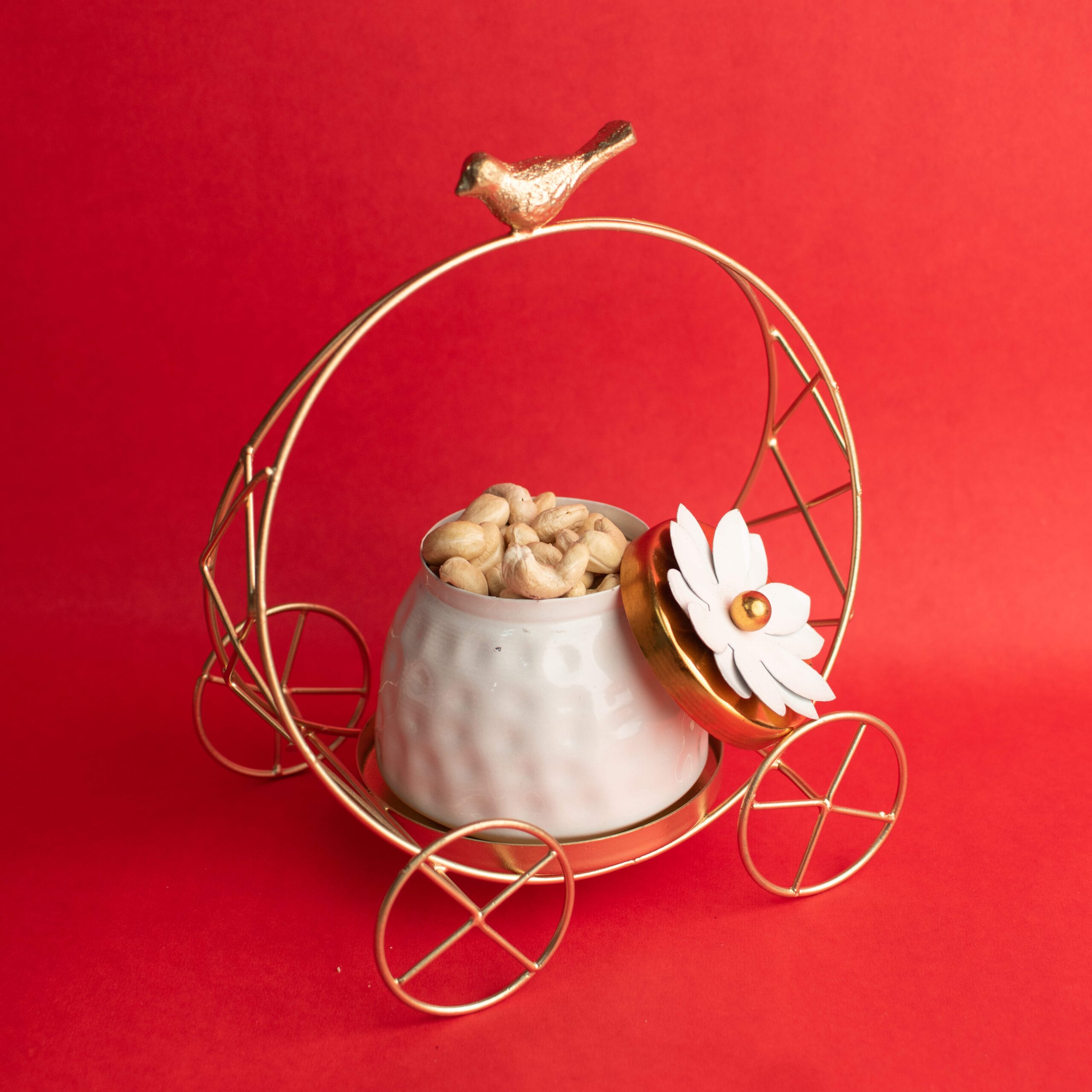 Add elegance to your kitchen and table décor with the DECORIQUE Iron Bird Cart Container with Bowl, a perfect blend of style and functionality. Crafted from durable iron with a radiant golden finish, this unique container is shaped like a decorative cart with a charming bird detail and floral design lid. Whether you’re storing dry fruits, nuts, candies, or small treats, this bowl doubles as a stylish centerpiece for your dining table, coffee table, or kitchen shelf. The intricate design adds a royal touch, making it ideal for festive occasions or everyday décor. A thoughtful gift for weddings, housewarmings, and festivals.