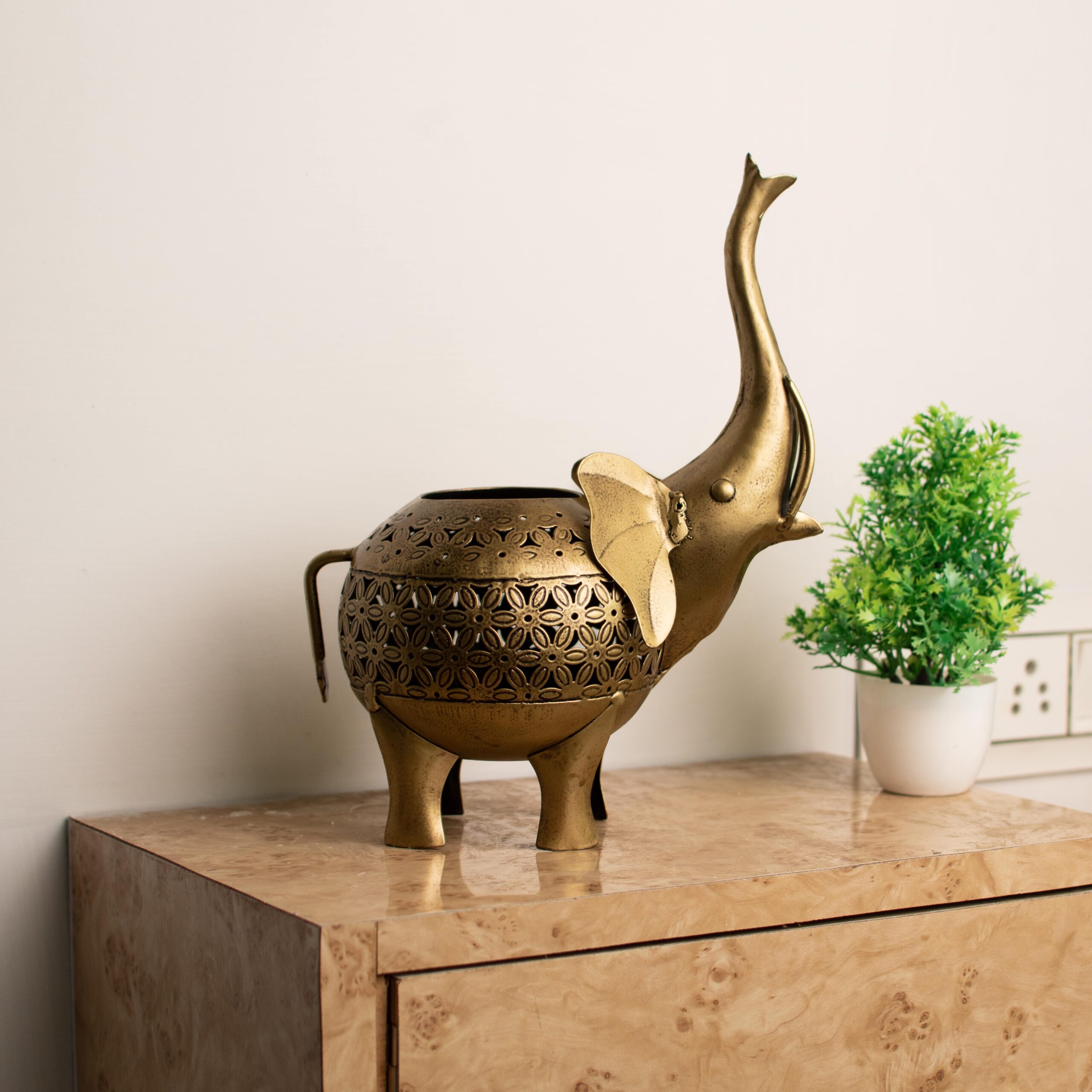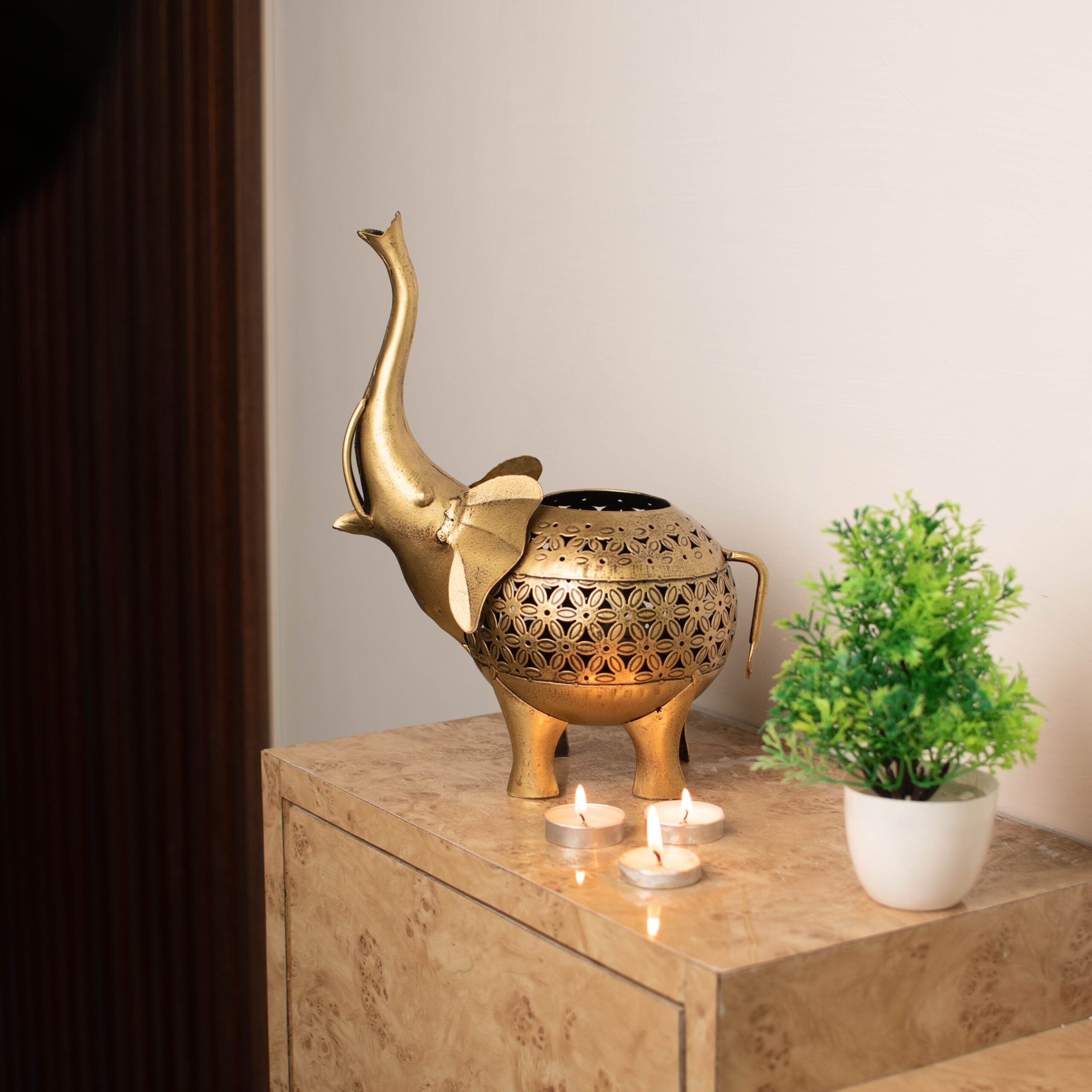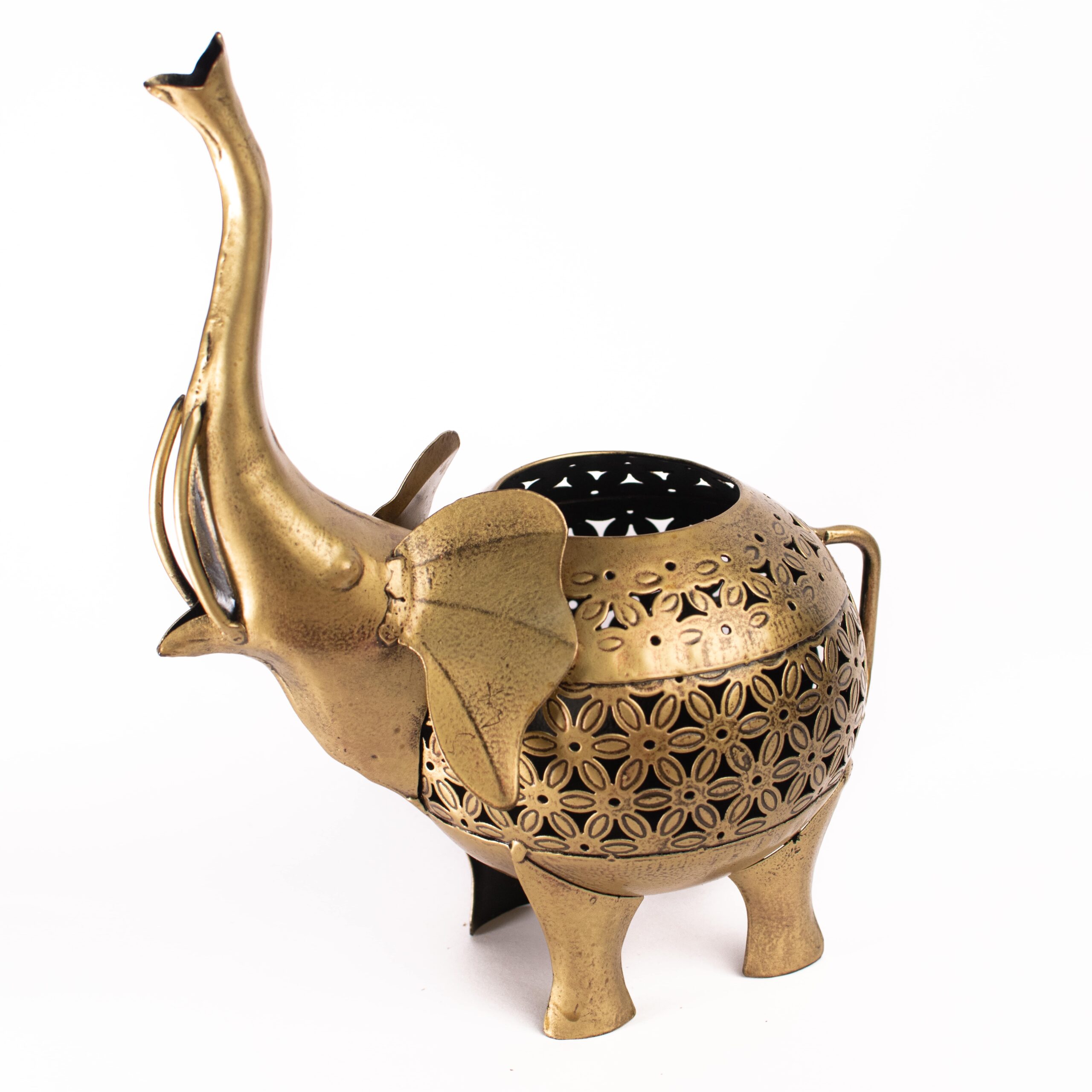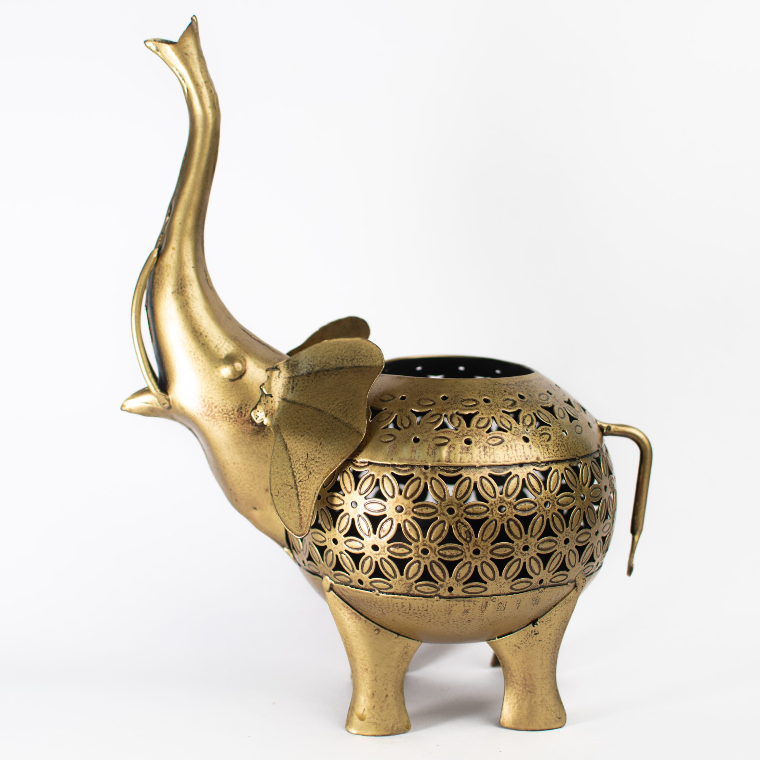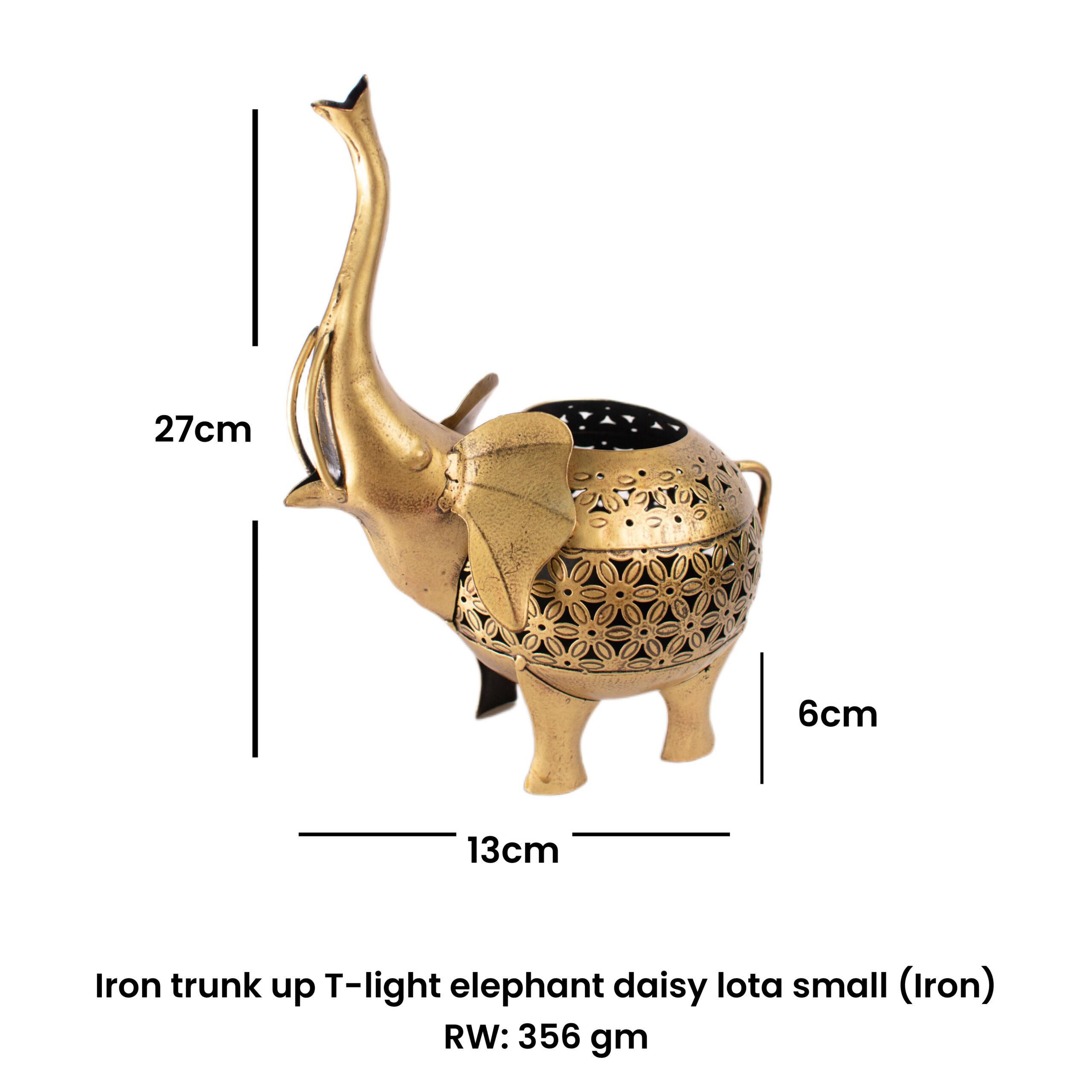 Infuse your space with artistic elegance and traditional charm with the Decorique Antique Iron T-light Elephant Daisy Lota. Crafted from high-quality iron with a rich antique gold finish, this exquisite piece features intricate daisy floral carvings and a majestic elephant design with its trunk raised—symbolizing prosperity and good luck.